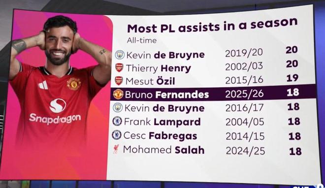 31岁的B费凭借在斯坦福桥的助攻,还实现了另一成就,他是英超史上第四位一个赛季客场10次助攻的球员。B费追平了2003/04赛季效力莱斯特城的穆齐·伊泽特(Muzzy Izzet)。在他面前,现在只有2014/15赛季的法布雷加斯和2024/25赛季的萨拉赫,他俩都有11次客场助攻。